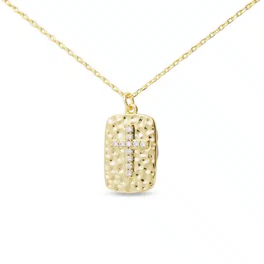Gold CZ Hammered Pendant Cross Necklace