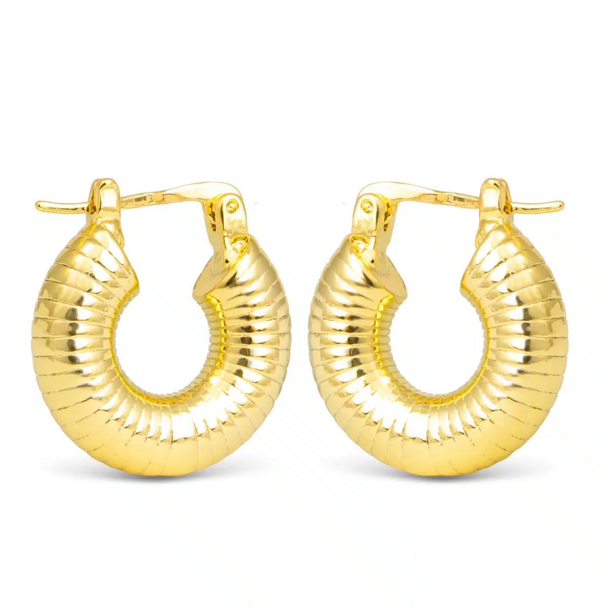 These polished gold ribbed hoop earrings add subtle texture and dimension to your style.