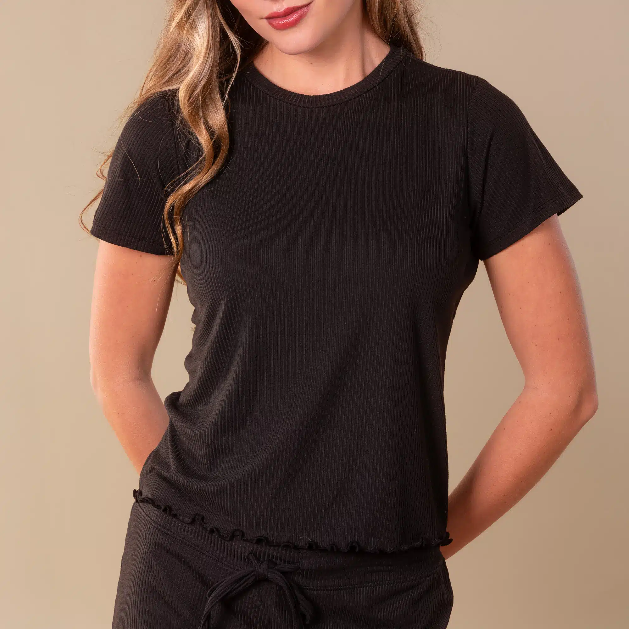 This PJ top, offered in 3 dreamy colors, Black, Coastal Blu (Blue), and Sunkissed Coral (Pink), is part of our Bliss Collection. With its lightweight, jersey rib fabric and feminine lettuce edge detail, the Bliss Collection offers effortless elegance. Pair this top with our matching tank, pants, and shorts for a perfect ensemble. All matching top and bottom pieces are sold separately.