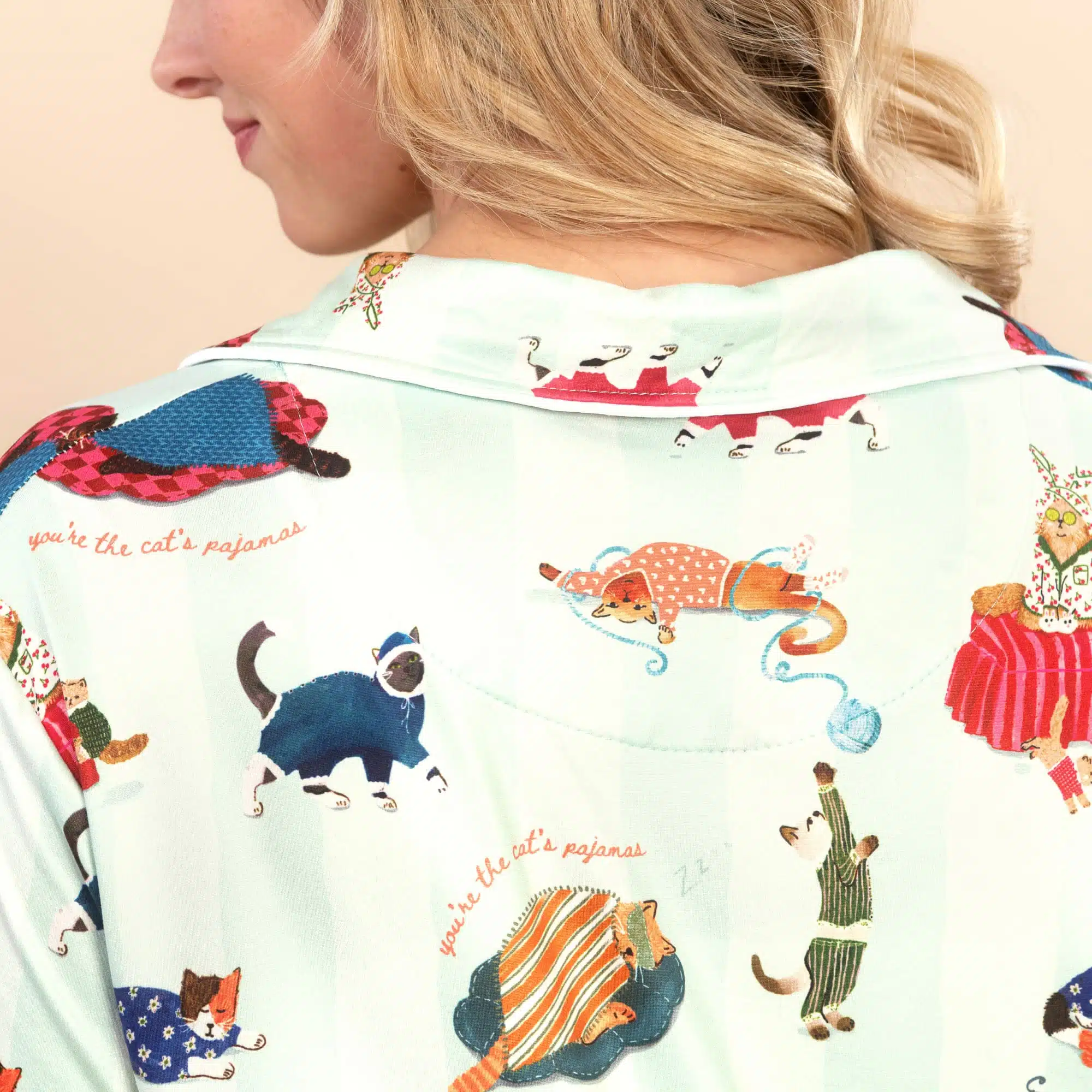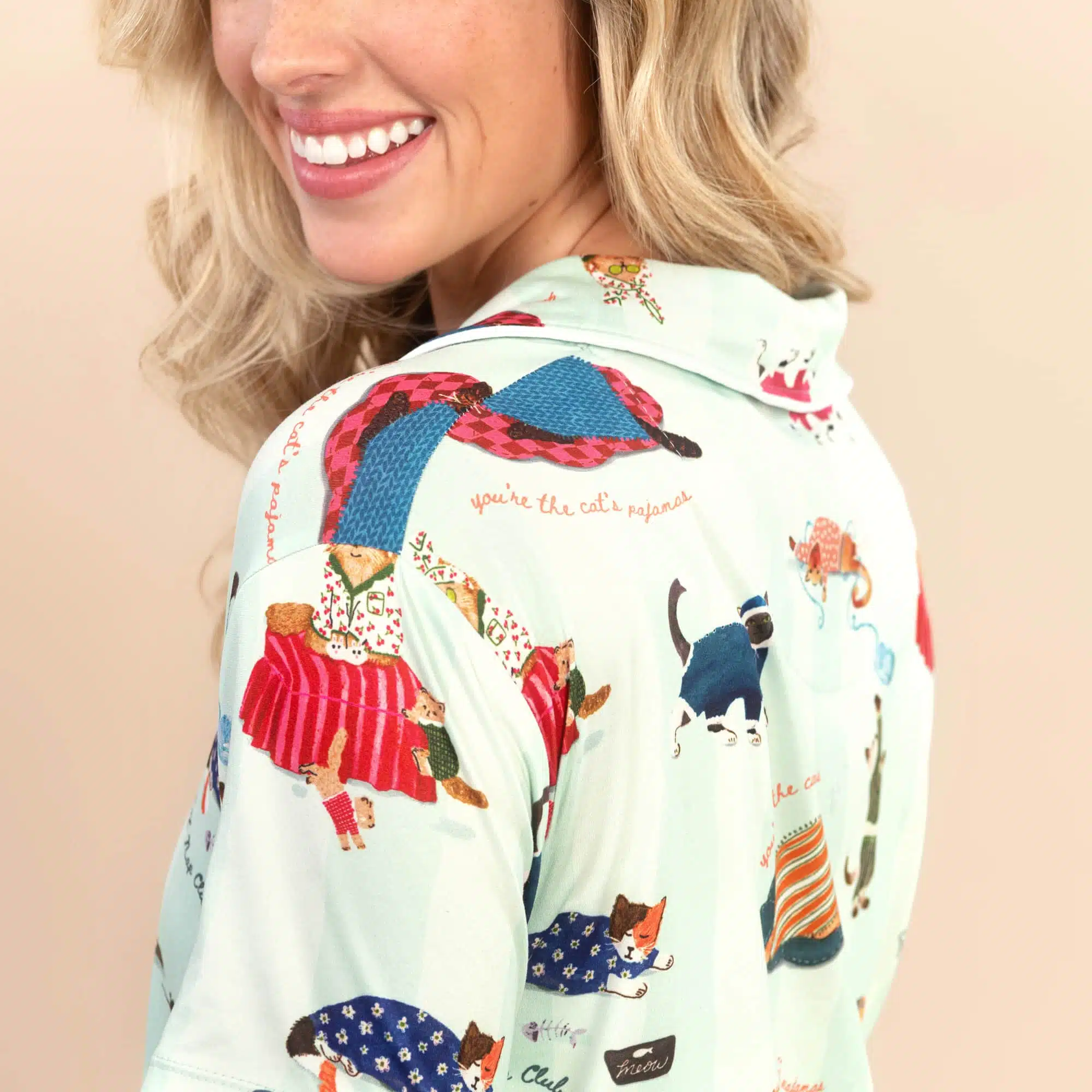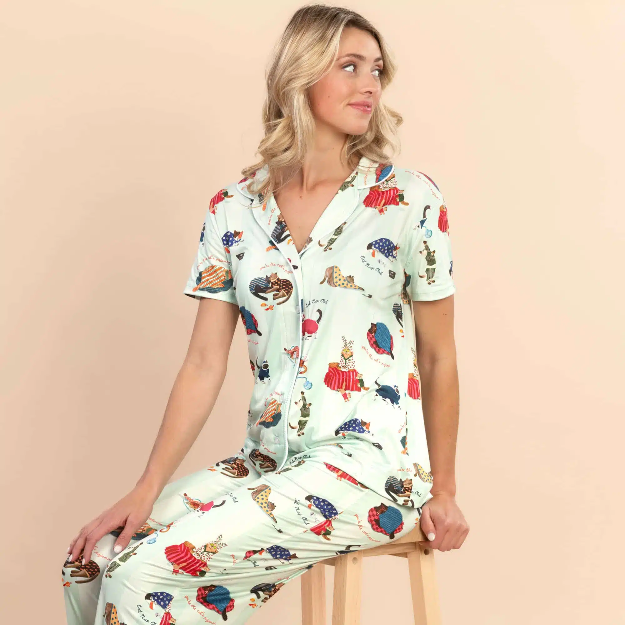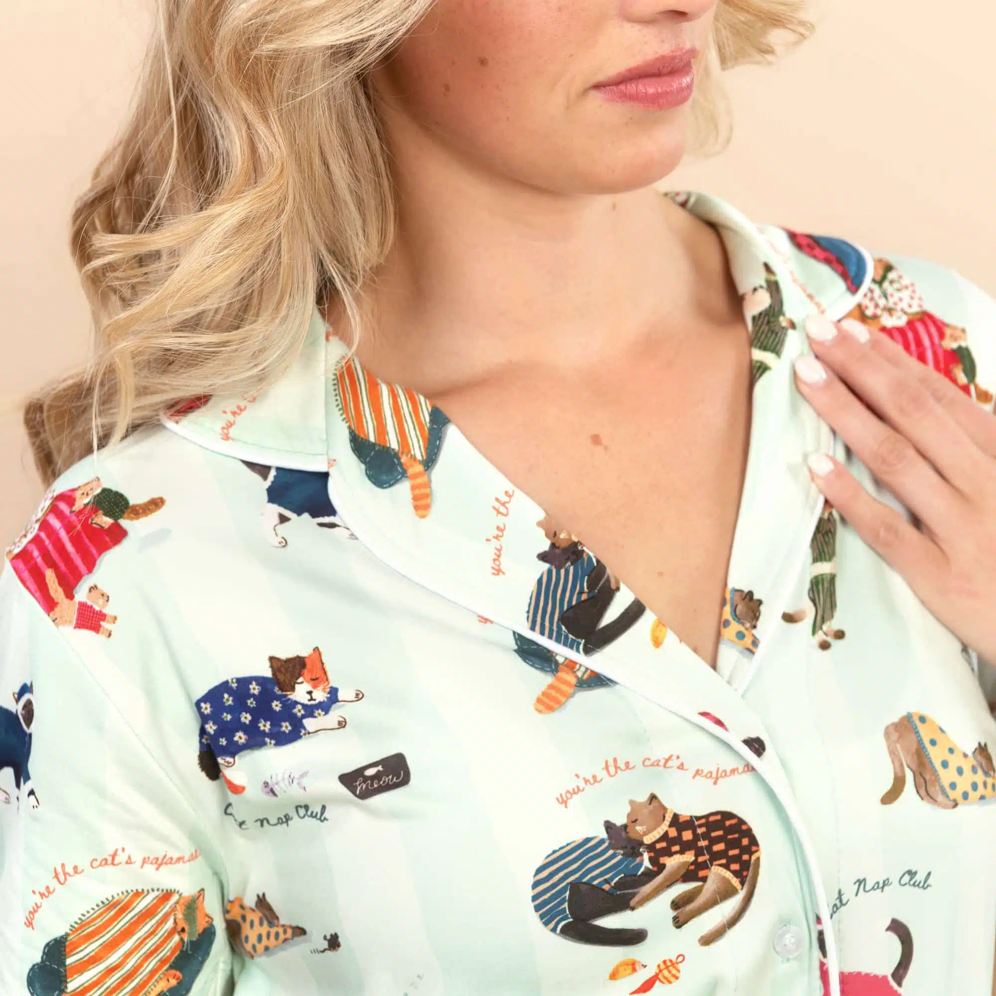 Purr-fect for relaxation, our cute ‘Cat Nap’ pajama top is sure to delight!
