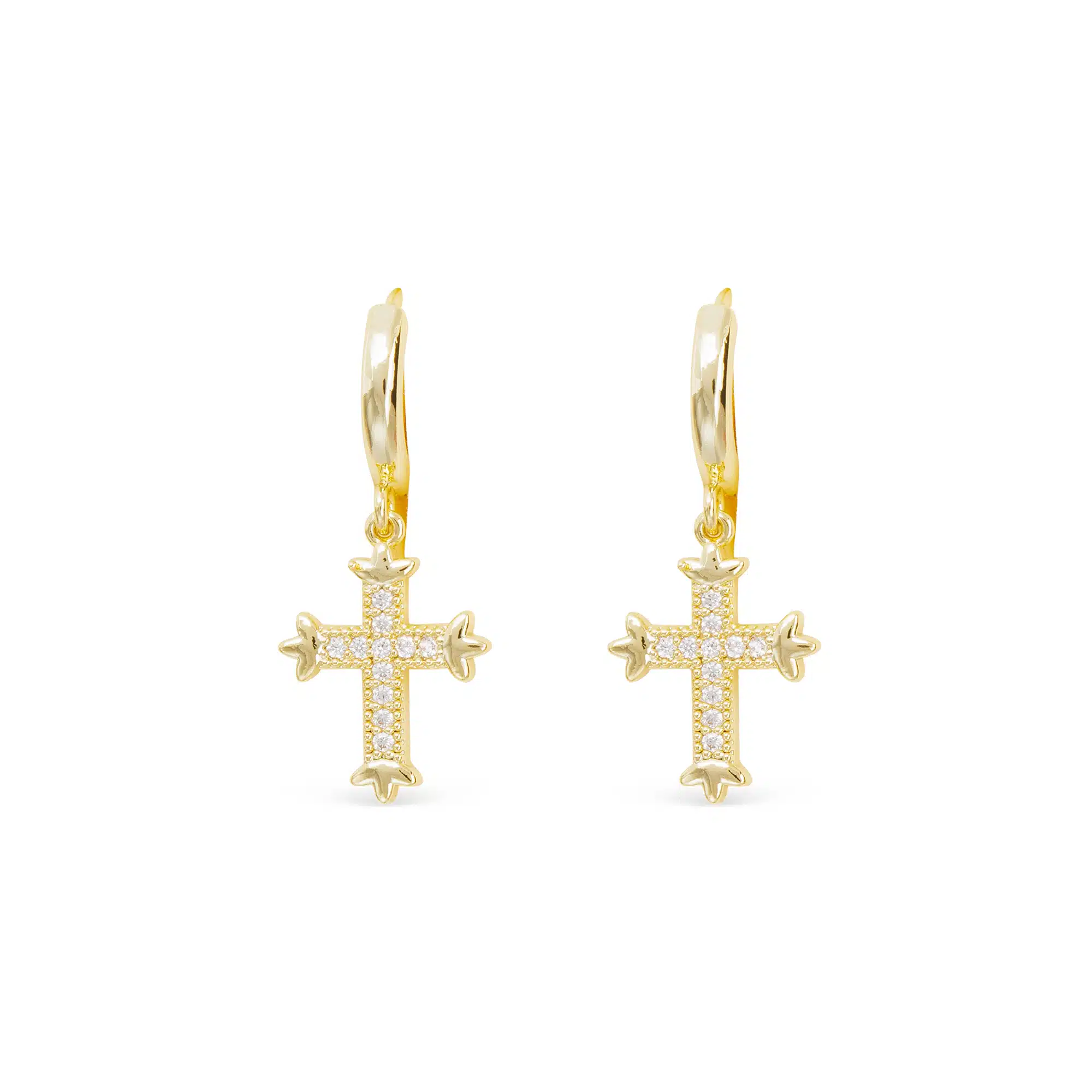 Dainty gold hoops featuring a small, vintage-inspired cross charm with intricate CZ detailing.