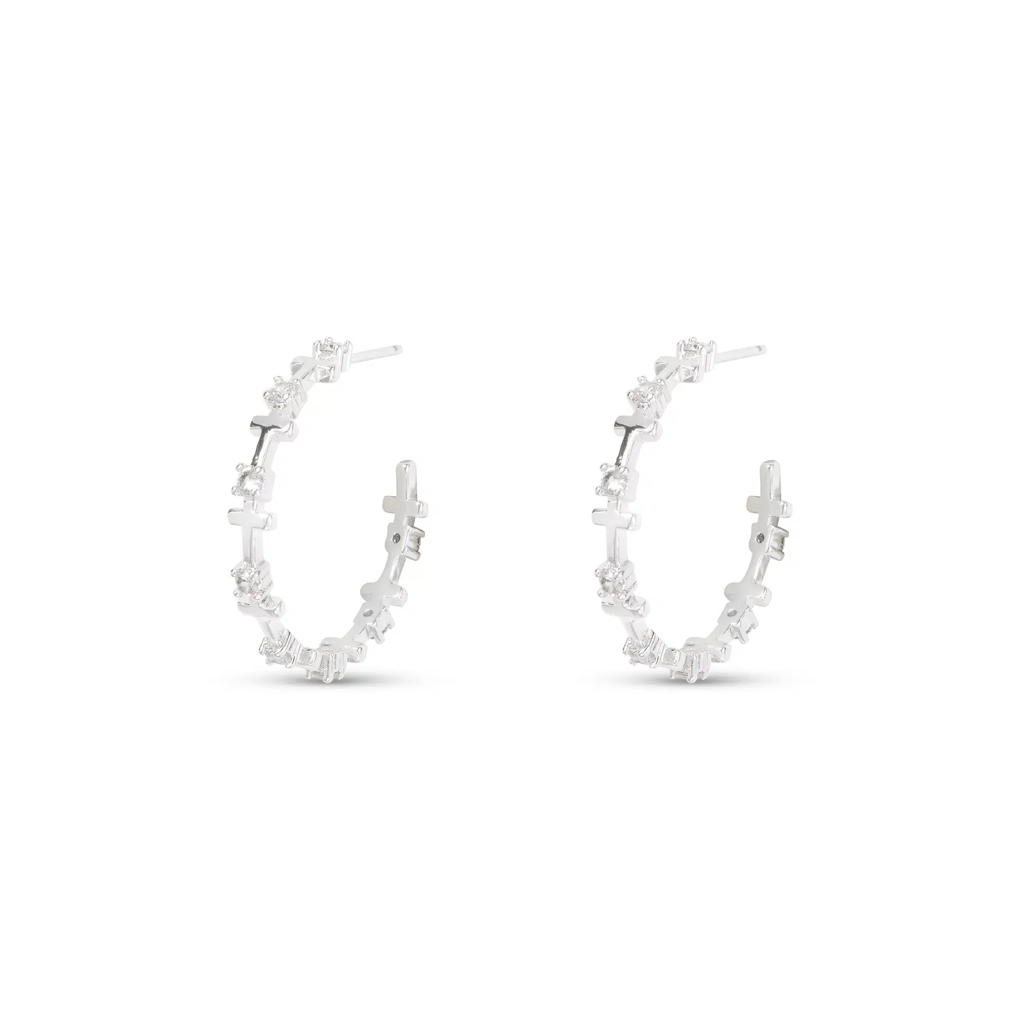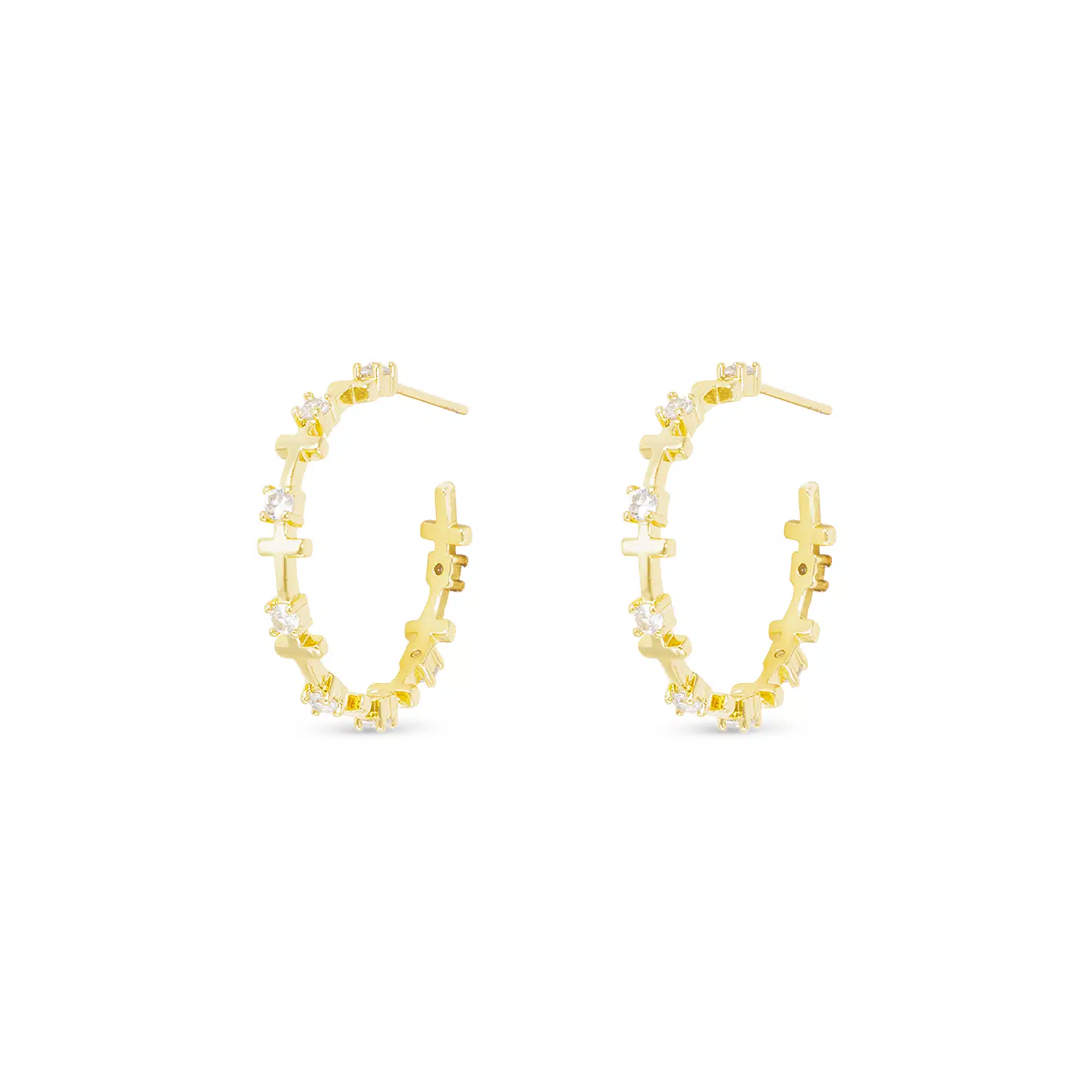 Elegant hoop earrings featuring a CZ-encrusted infinity symbol integrated with a classic cross.