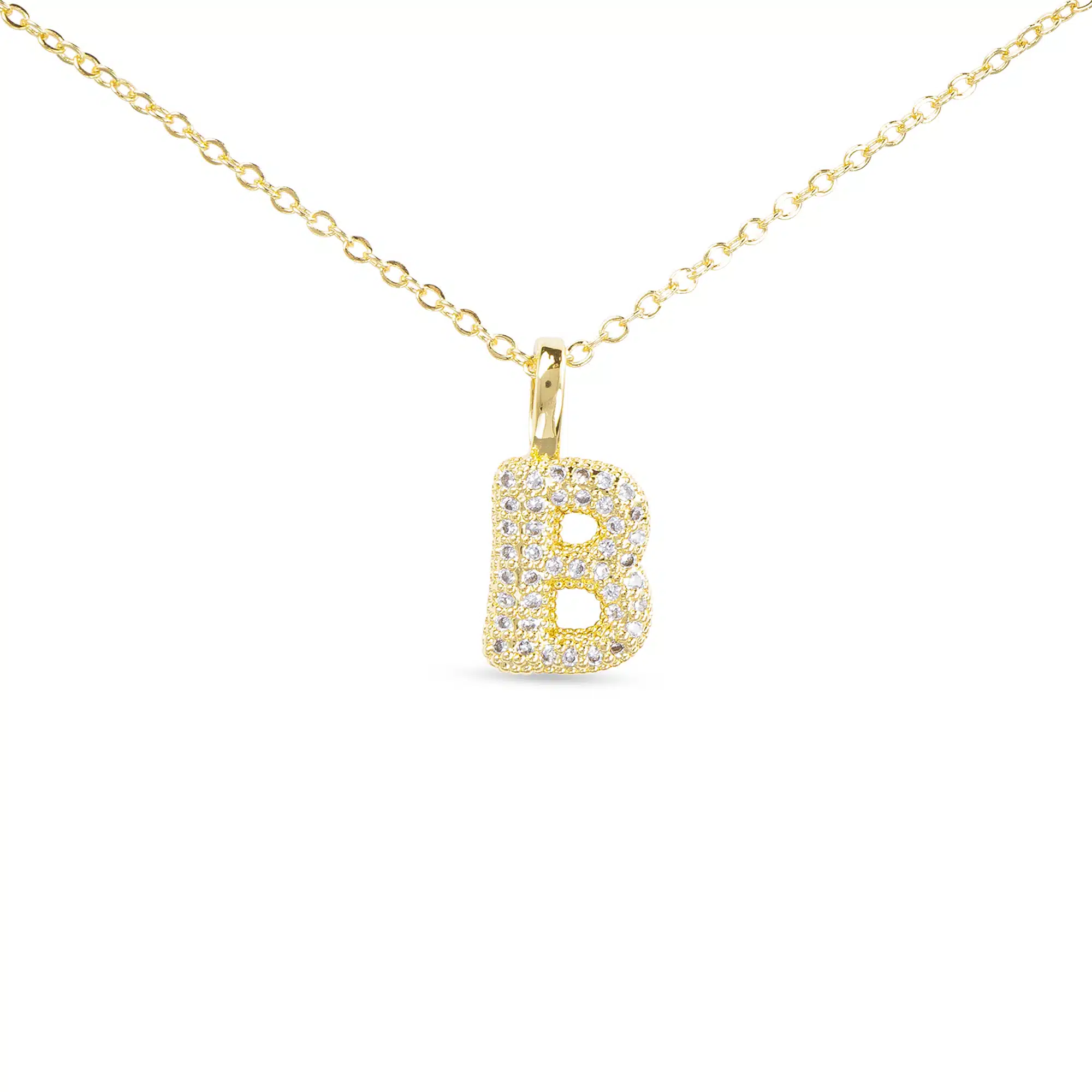 A bold statement necklace featuring a large, high-shine initial pendant encrusted with shimmering CZ stones.