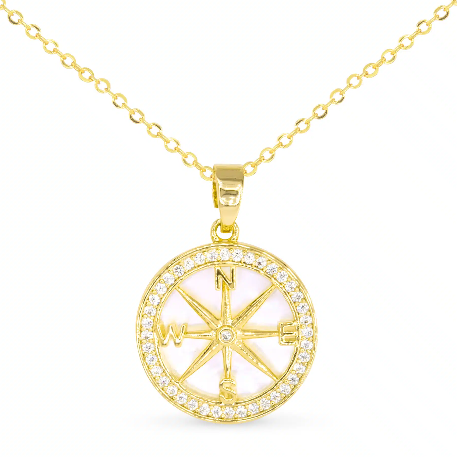 Navigate your style with this CZ and Mother of Pearl compass necklace, crafted in a radiant gold finish. A symbolic piece that blends direction and elegance beautifully.