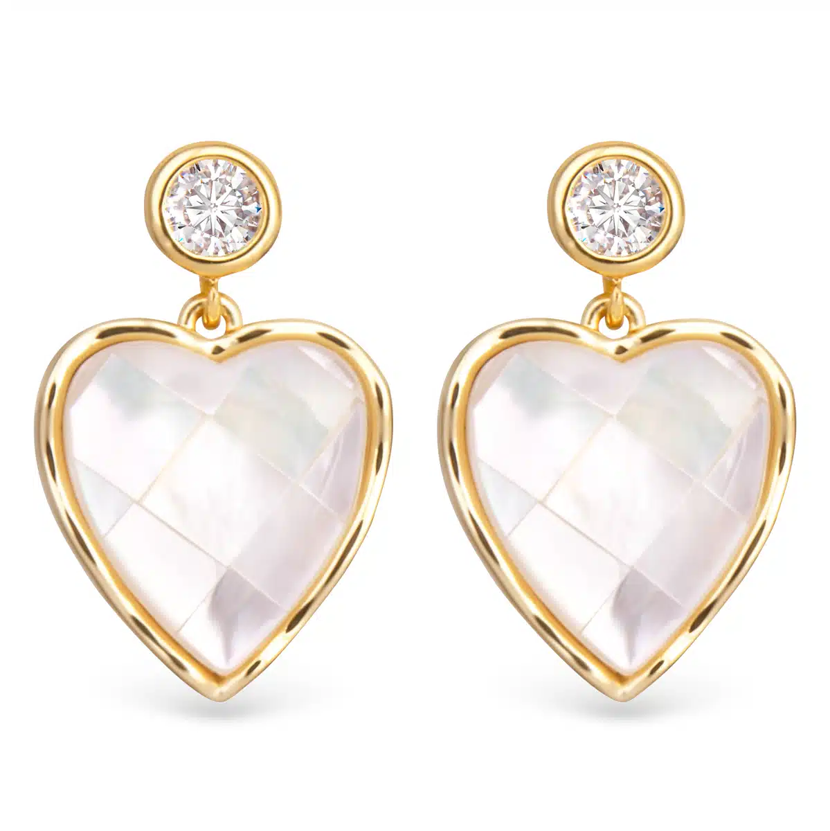 Mosaic heart earrings featuring CZ and Mother of Pearl set in gold. A romantic accessory that adds a touch of sparkle to your look.