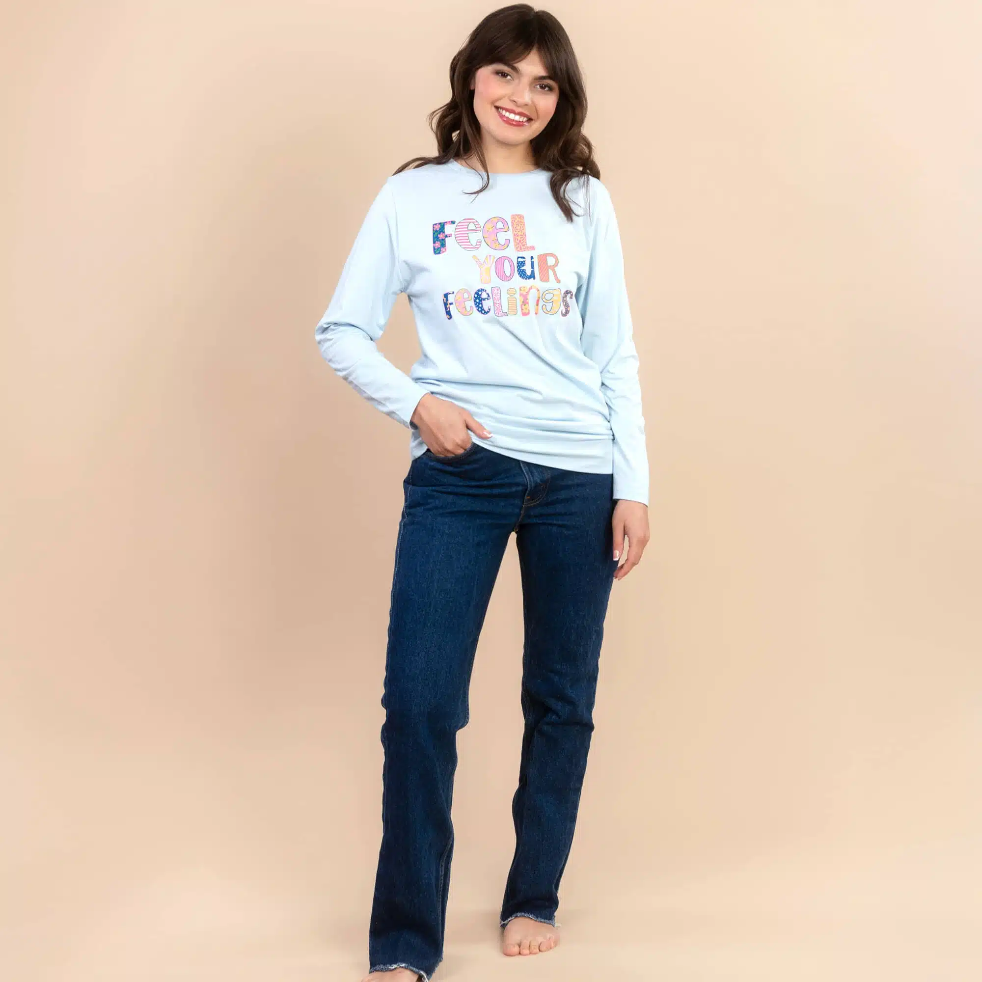 Embrace emotional wellness in the calming color of our ‘Feel Your Feelings’ everyday tee!