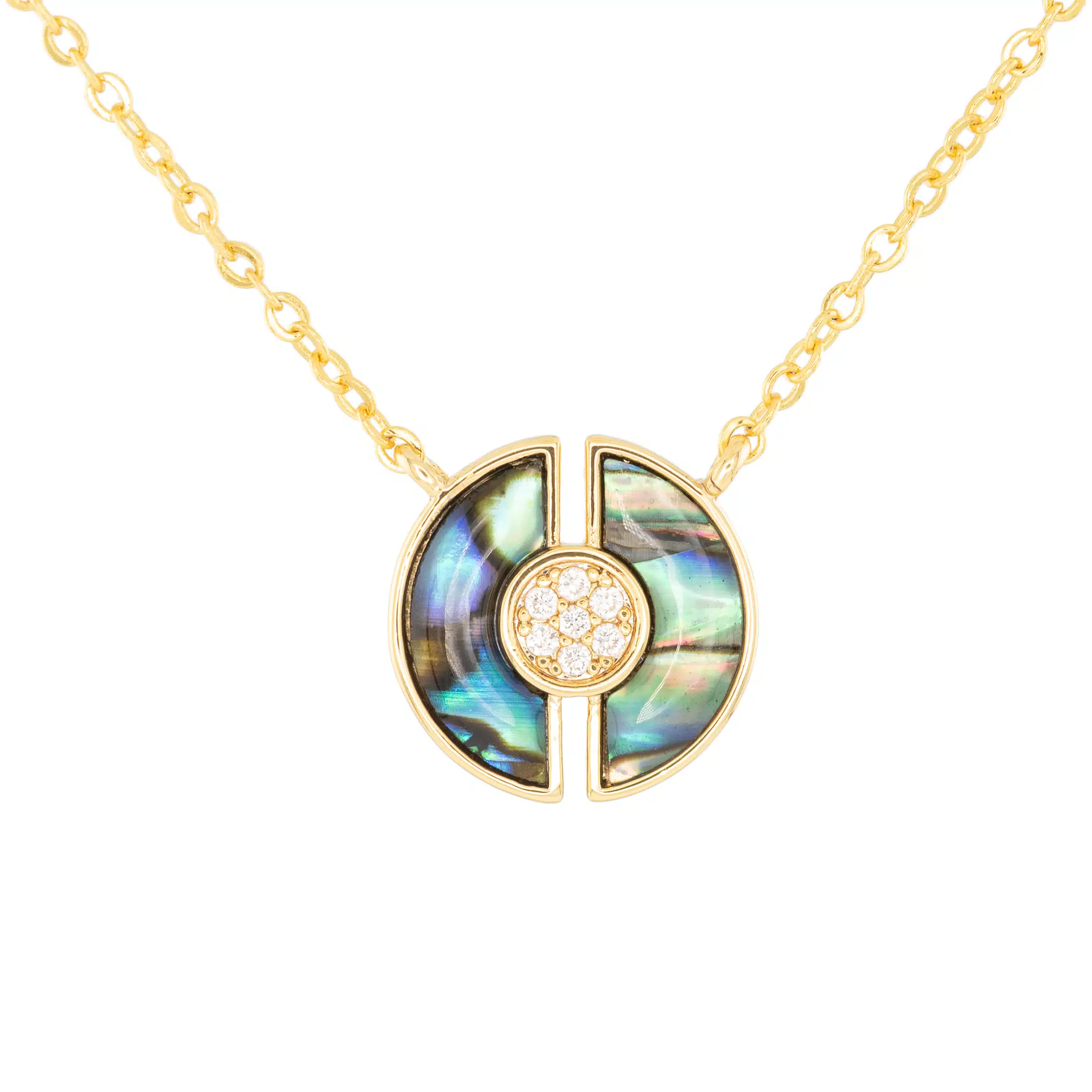 This elegant gold abalone and cubic zirconia circle necklace in blue is a modern and versatile accessory.