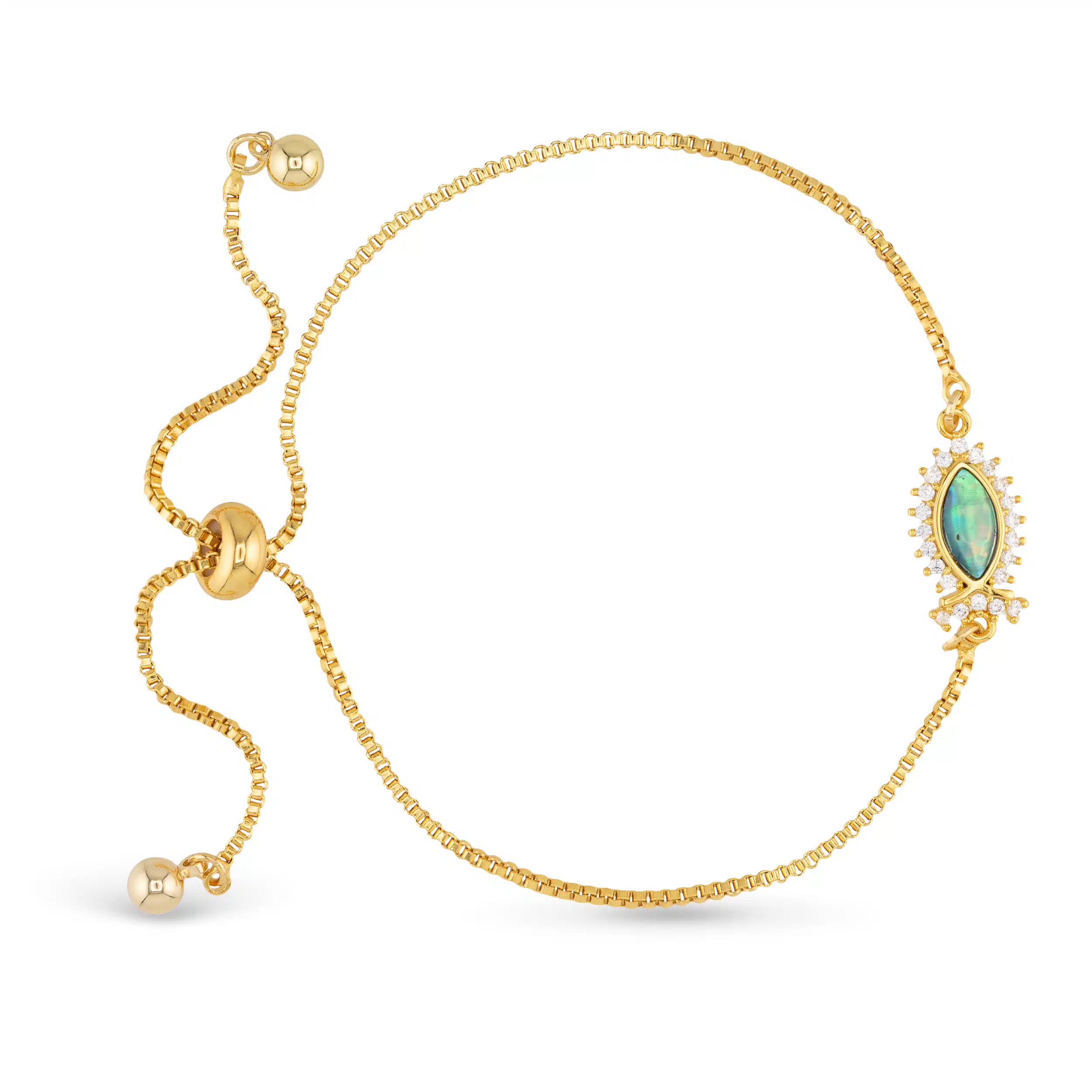 A unique and playful gold abalone and cubic zirconia fish bracelet that adds a fun touch to any outfit.