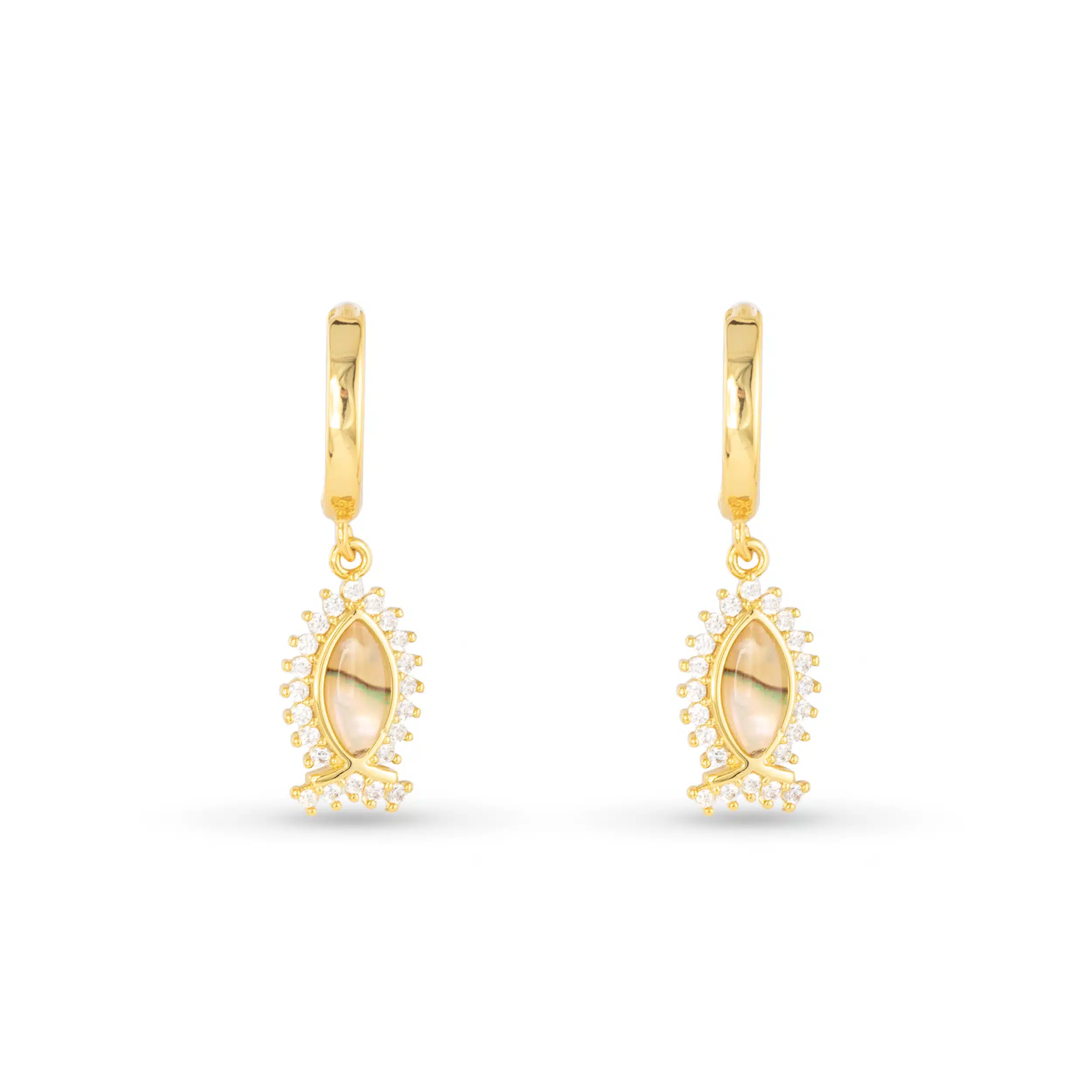 A unique and charming choice, these gold abalone and cubic zirconia tan fish drop earrings are a great conversation starter.