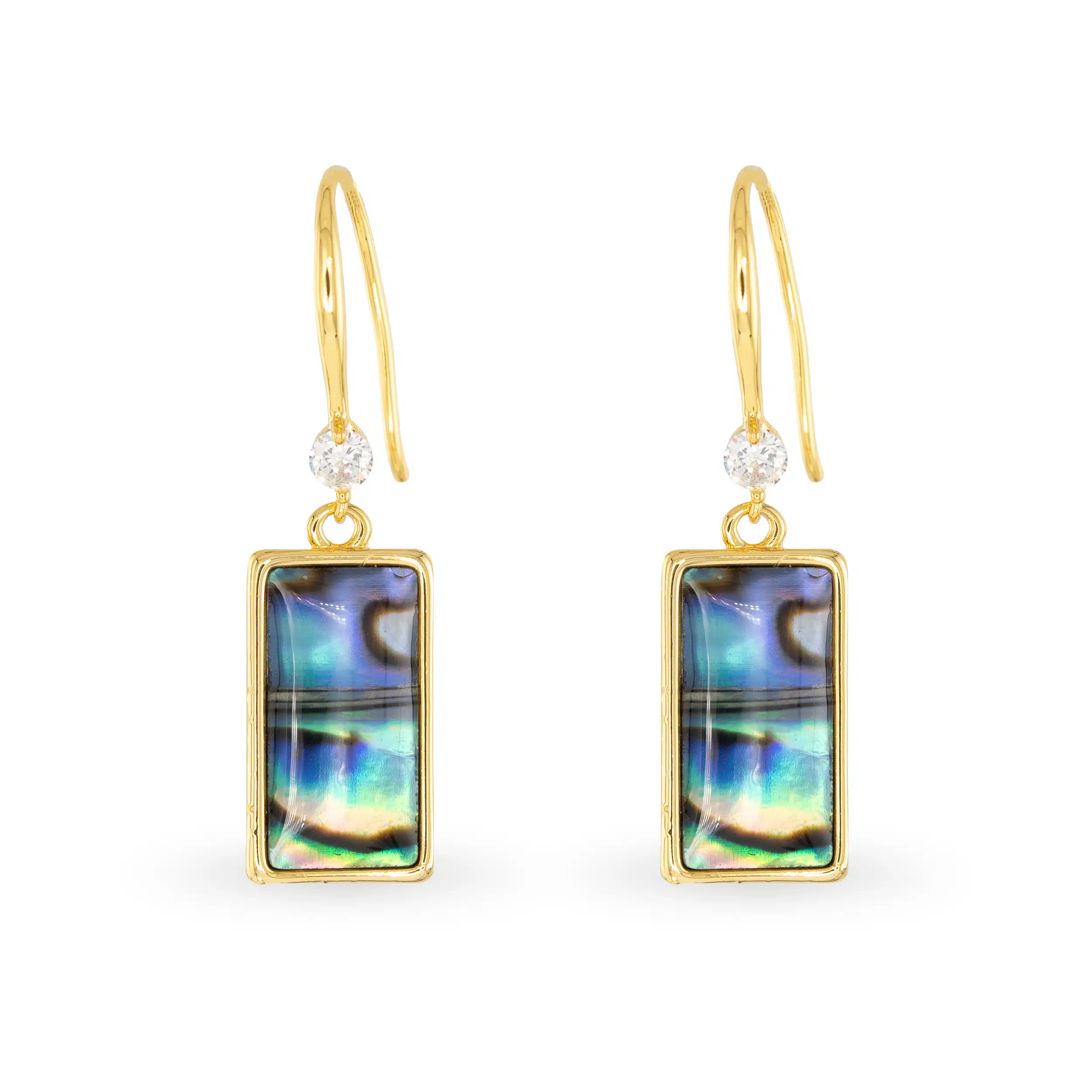 A modern and elegant choice, these gold rectangle drop earrings highlight a stunning abalone inlay.