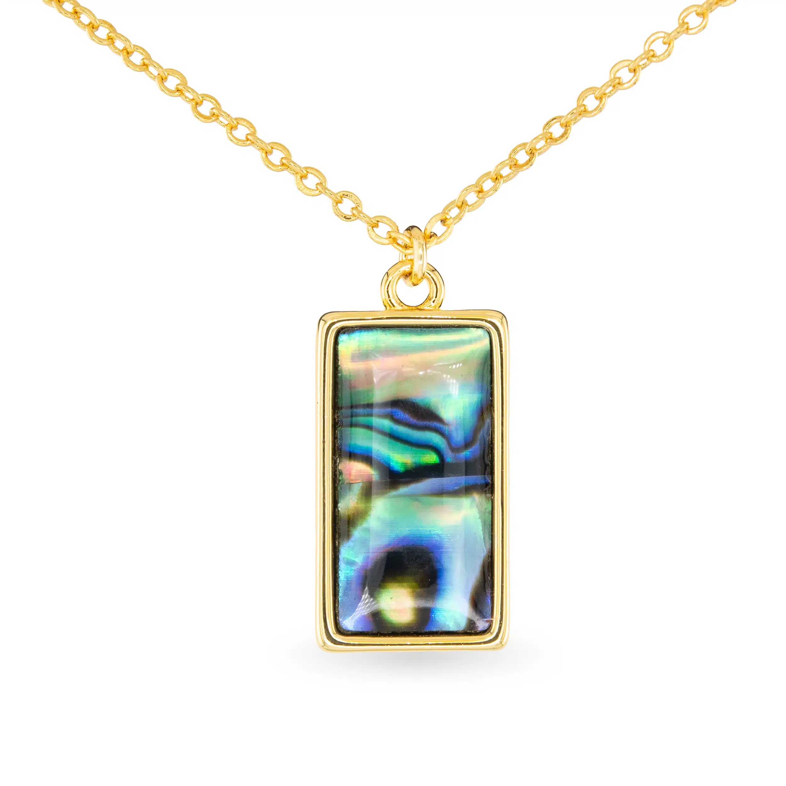 A sleek and modern gold abalone necklace featuring a rectangular pendant.