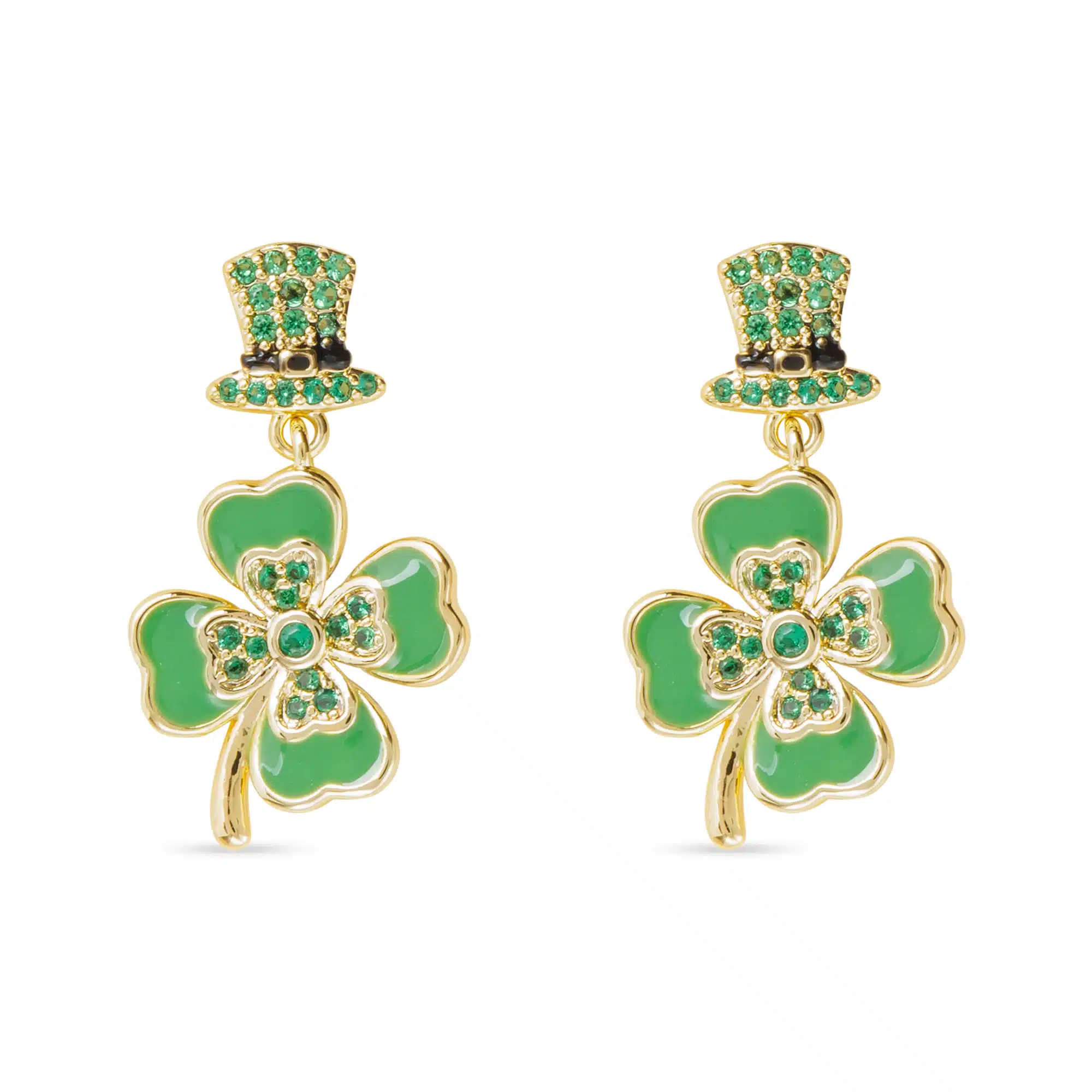 A dynamic set of earrings featuring a vibrant green hat and a sparkling clover charm.