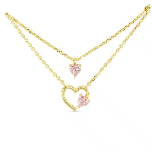 Two pink heart charms shine with CZ brilliance in this gold necklace. A sweet and stylish way to show love and sparkle.