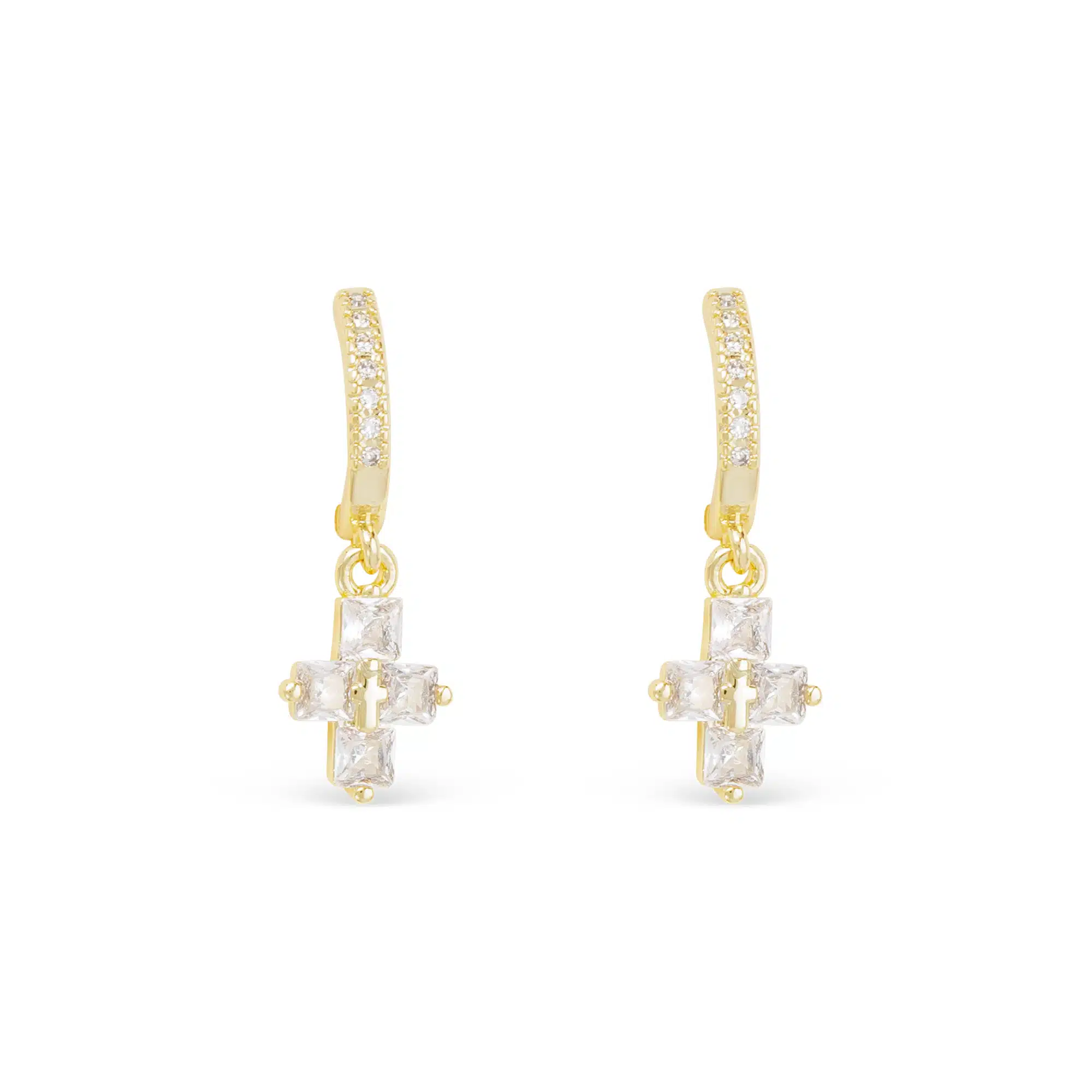 Gold CZ Hoop Small Baguette Cross Drop Earrings