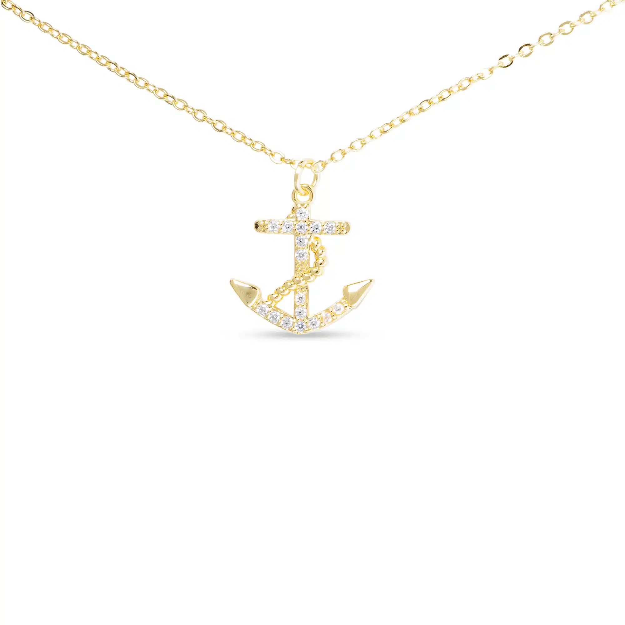 A classic maritime-inspired gold necklace featuring a medium-sized anchor pendant with CZ accents.