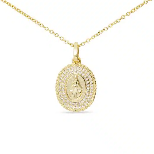 A sacred gold medallion featuring the Miraculous Medal image framed by a halo of glittering CZ stones.