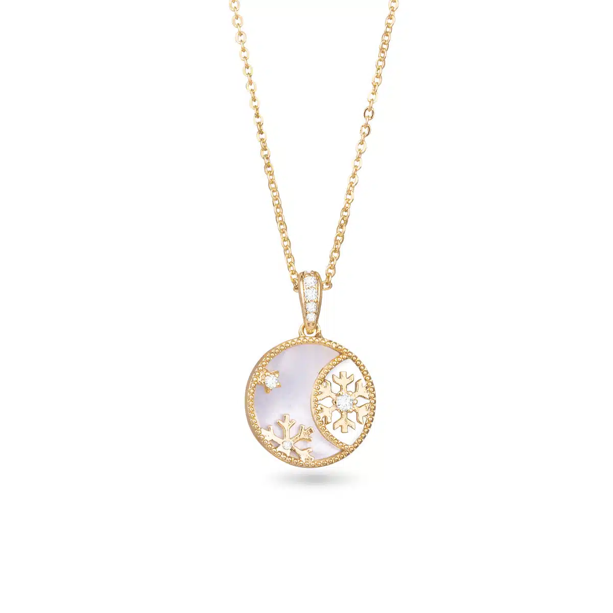 Snowflake ornament necklace featuring CZ and luminous Mother of Pearl set in gold. A festive accessory that adds a touch of sparkle to your look.