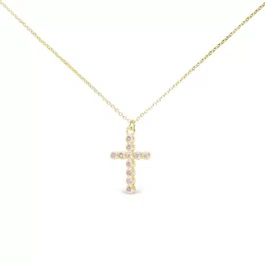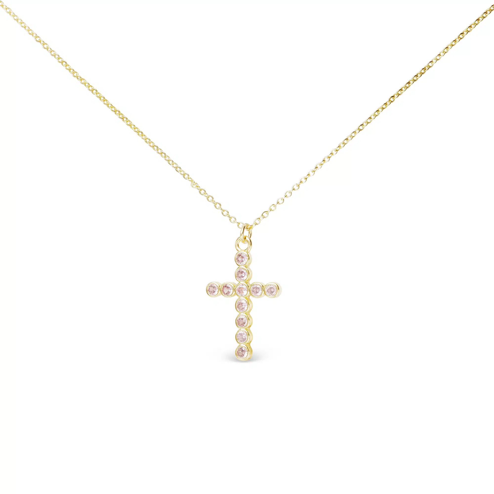 A charming gold necklace featuring round-set pink CZ stones arranged in a classic cross shape.