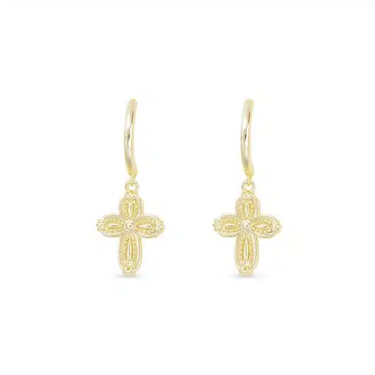 Sophisticated gold hoop drop earrings featuring small, patterned crosses with an intricate finish.