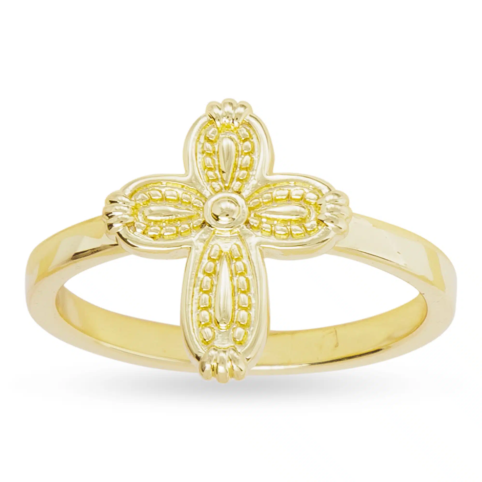 A delicate gold ring featuring a small, patterned cross design that offers a refined and symbolic look.