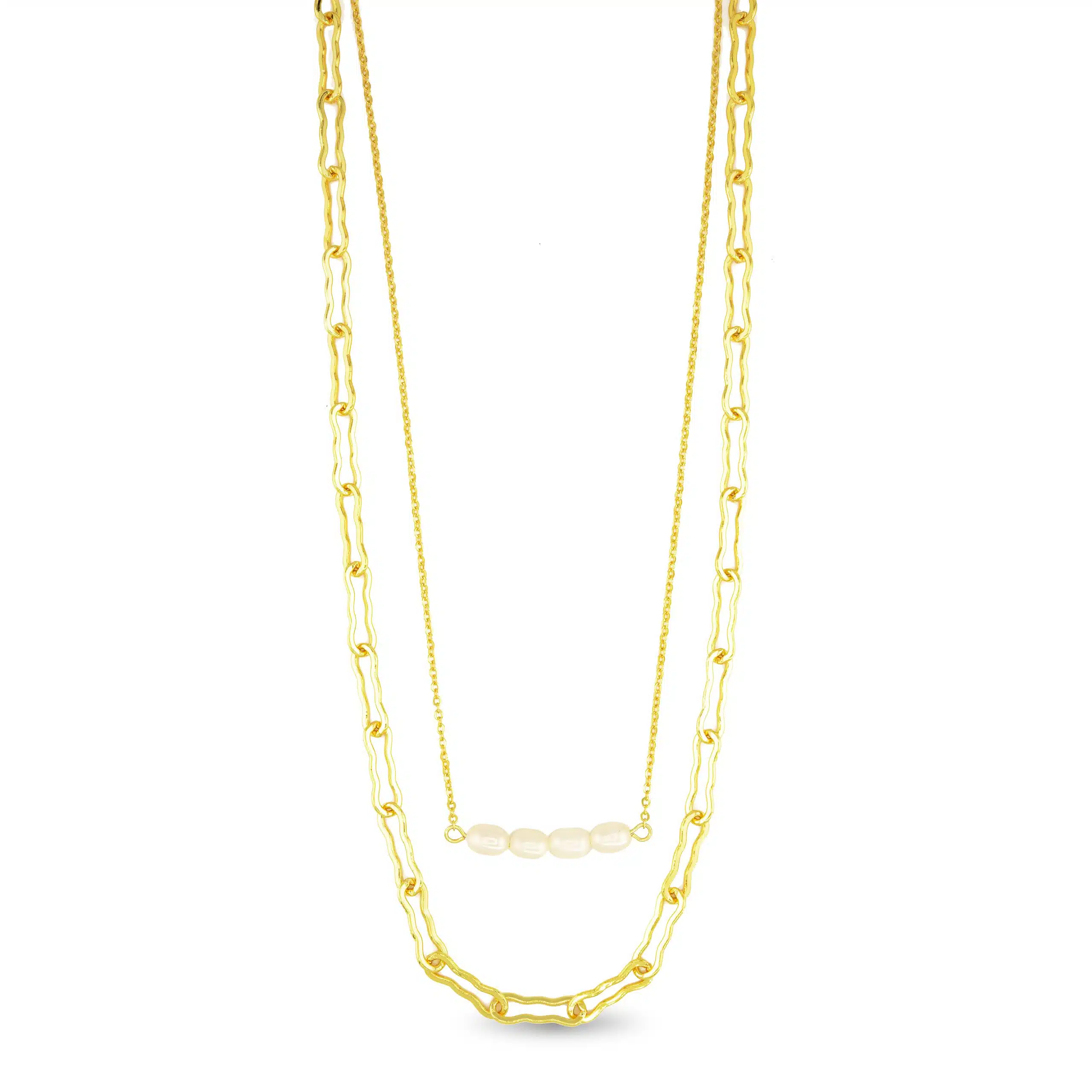 This layered necklace features a sleek gold bar accented with pearls for a modern, elegant look. A versatile piece perfect for both casual and formal wear.