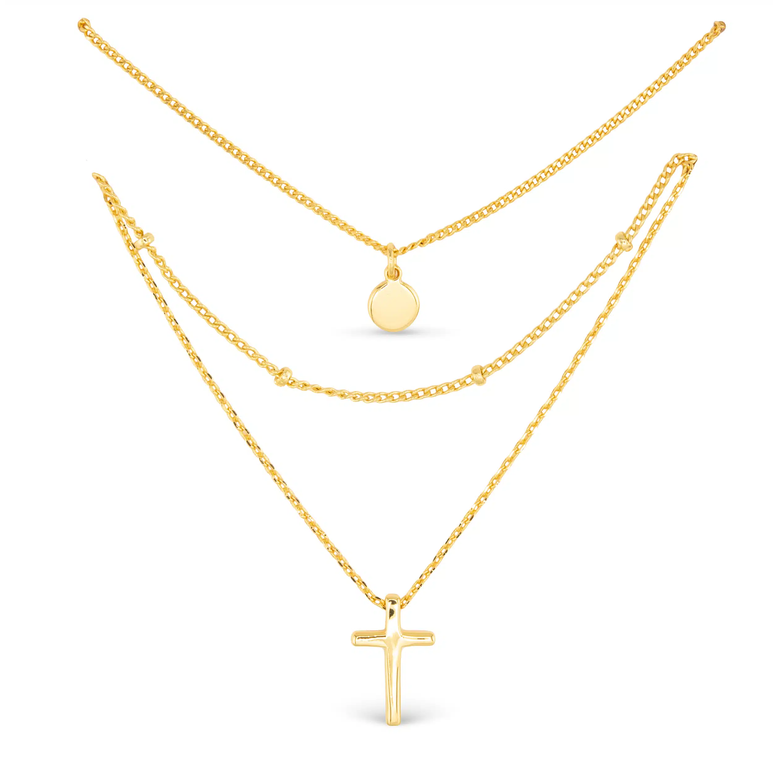 Three delicate gold layers each feature a unique cross charm, creating a meaningful and stylish statement. Perfect for layering with other favorites or wearing solo.