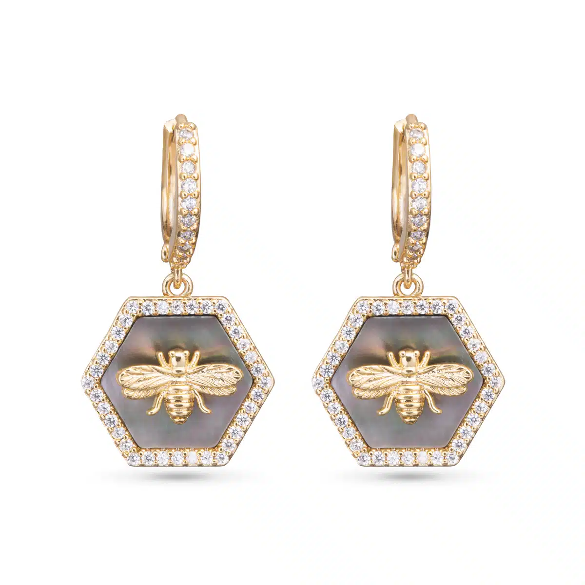 Hexagon earrings featuring grey Mother of Pearl, CZ, and a bee charm set in gold. A unique and elegant accessory that adds a touch of nature to your look.