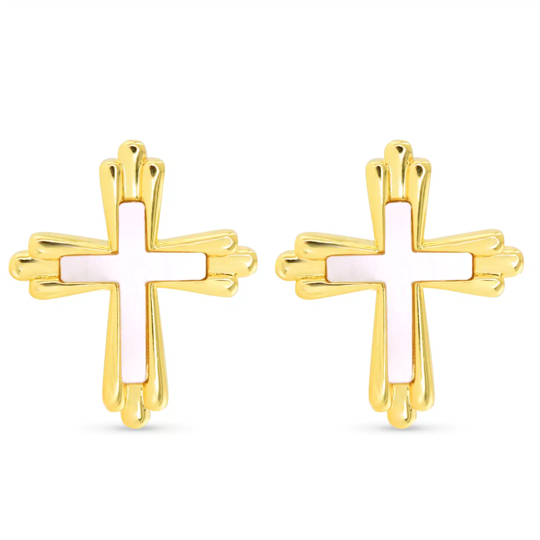 These traditional cross earrings feature inset Mother of Pearl for a classic yet radiant look. A meaningful design that blends faith with elegance.