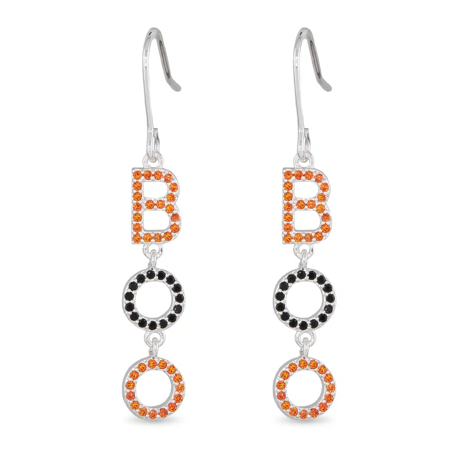 Get into the Halloween spirit with these ‘BOO’ earrings, sparkling with black and orange cubic zirconia.