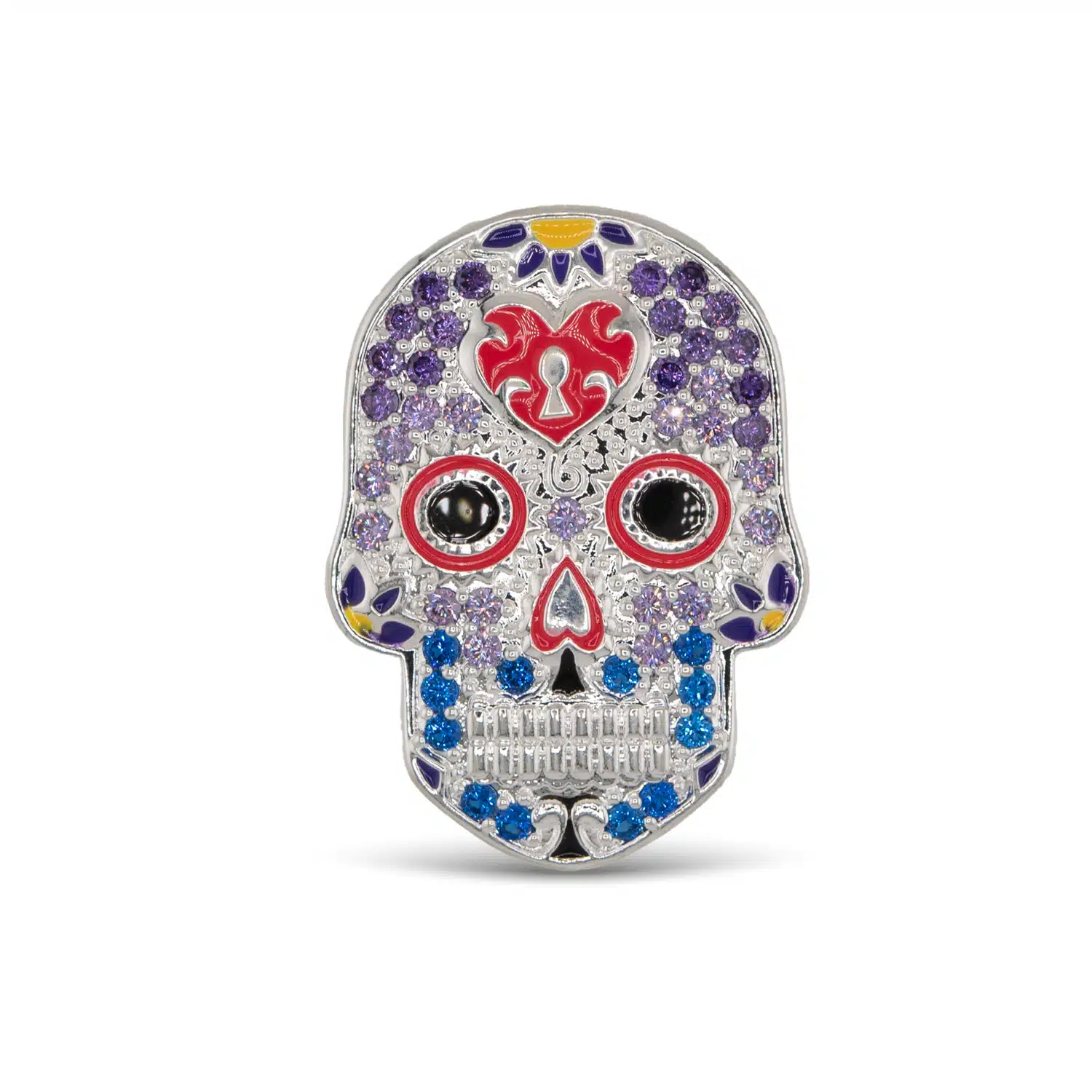 A vibrant sugar skull pin featuring intricate cubic zirconia details and colorful enamel.