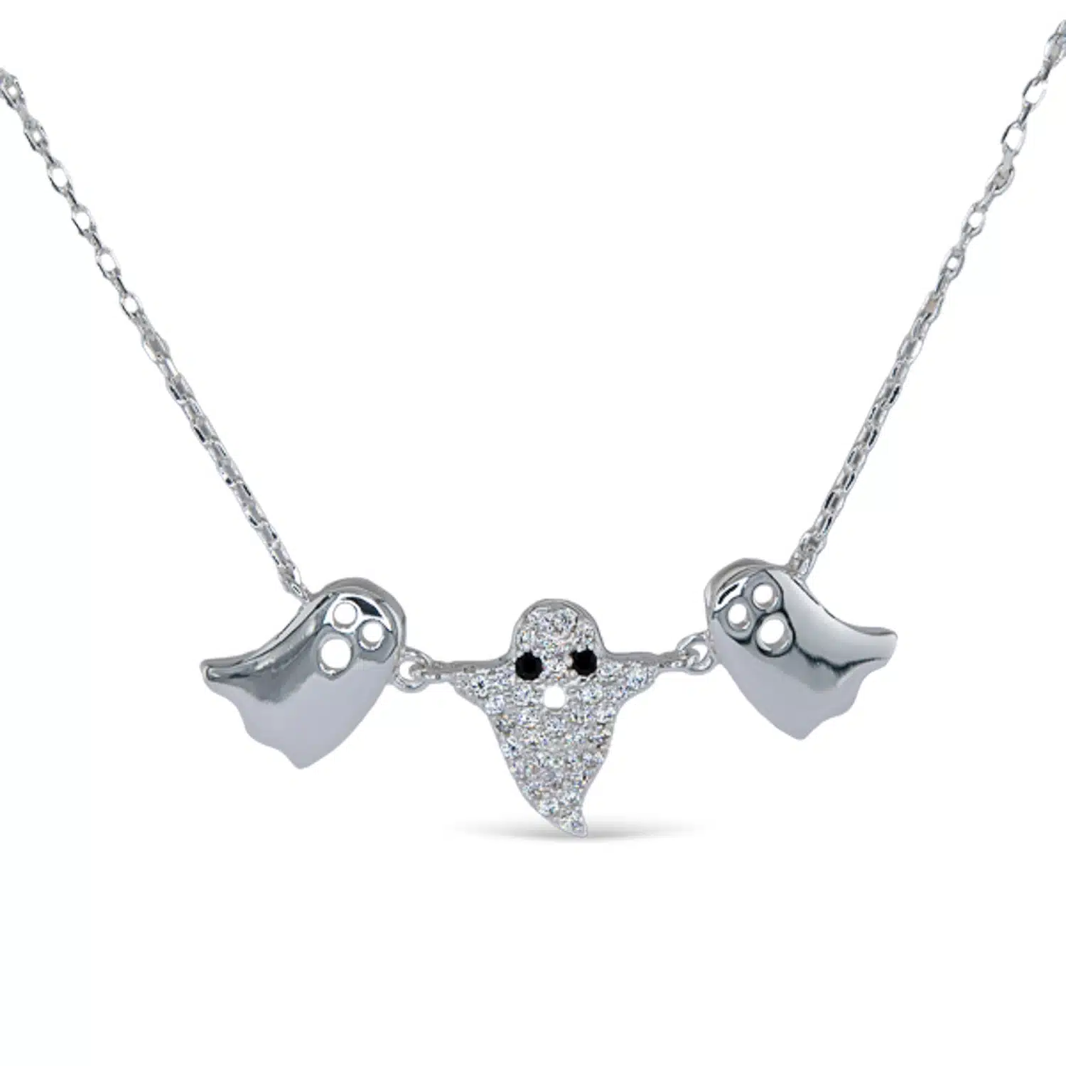 A simple yet spooky ghost pendant necklace, highlighted with clear cubic zirconia for a touch of sparkle.