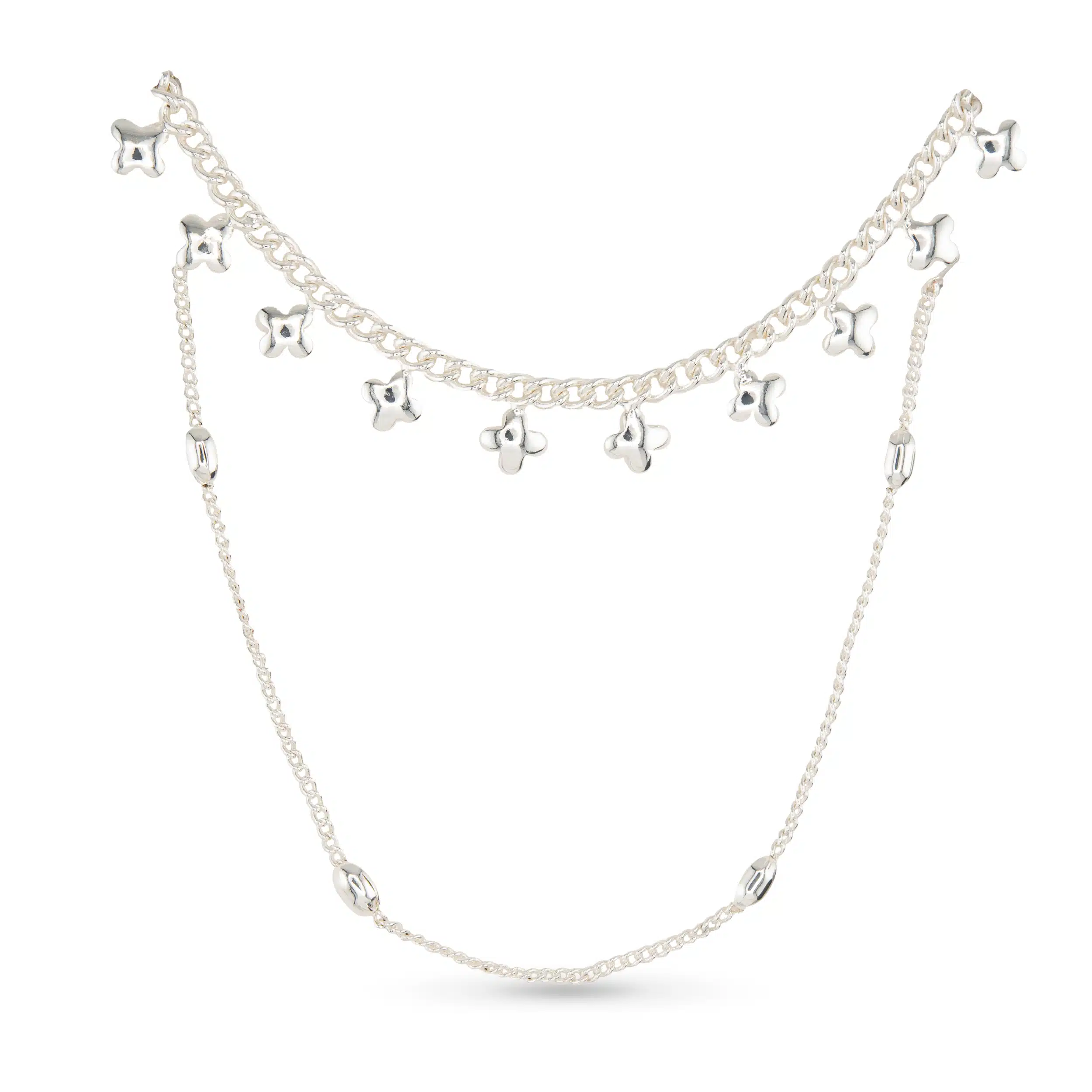 This silver necklace features dual layers with a clover flower motif for a touch of luck and beauty. A graceful accessory with timeless appeal.