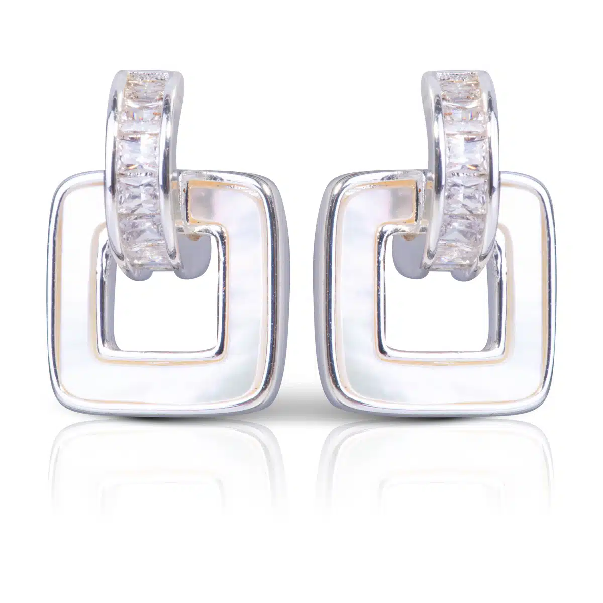 Square earrings featuring CZ and luminous Mother of Pearl accents. A modern and elegant accessory that adds a touch of sophistication to your look.