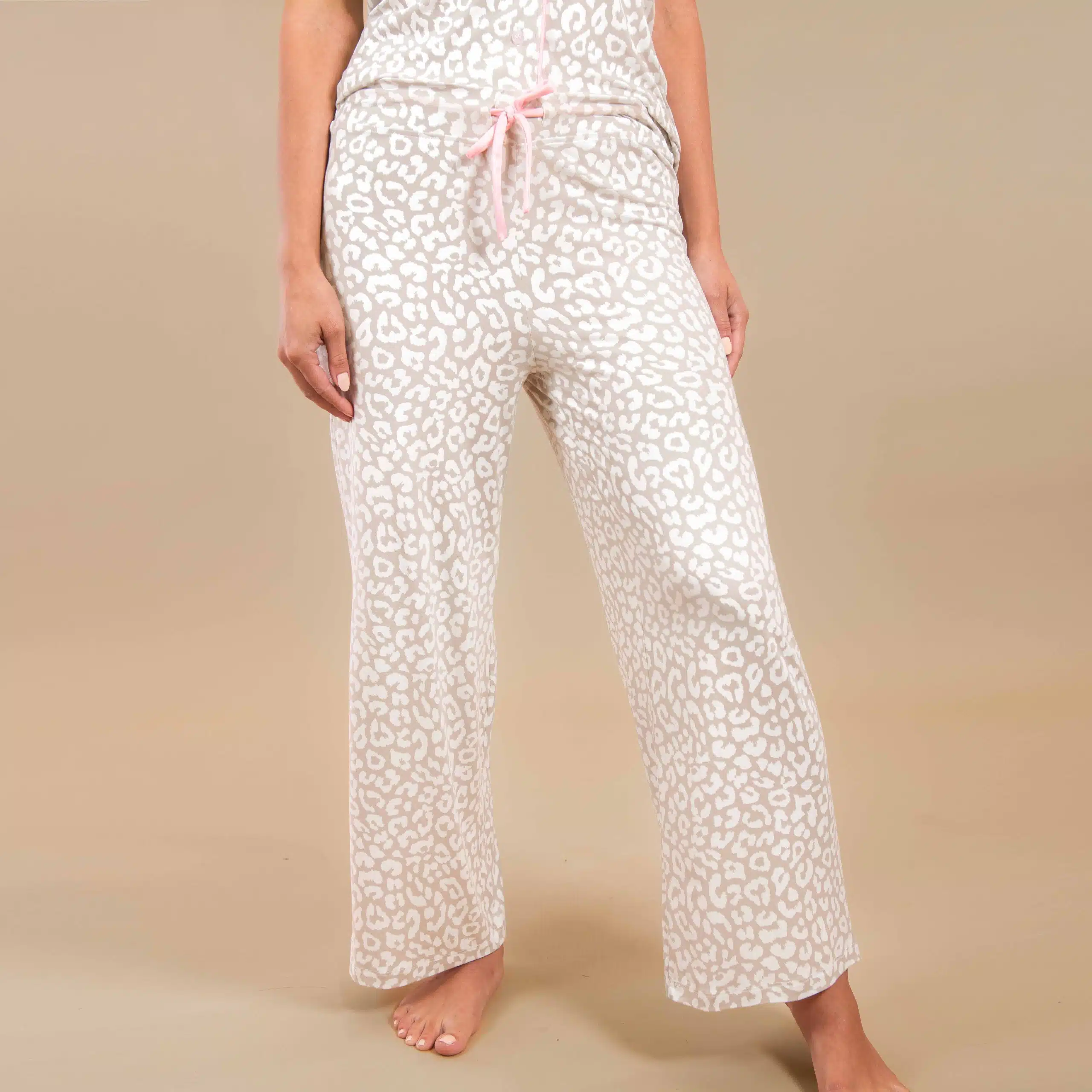Feel confident and chic in our glamorous ‘Taupe Leopard’ pajama pants. This timeless print is perfect for those who love a touch of luxury.